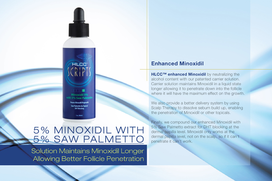 Finally, we compound our enhanced Minoxidil with 5% Saw Palmetto extract for DHT blocking at the dermal papilla level. Minoxidil only works at the dermal papilla level, not on the scalp, so if it can't penetrate it can't work.