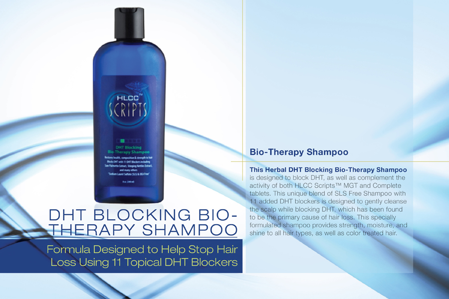 This Herbal DHT Blocking Bio-Therapy Shampoo is designed to block DHT, as well as complement the activity of both HLCC Scripts™ MGT and Complete tablets. This unique blend of SLS Free Shampoo with 11 added DHT blockers is designed to gently cleanse the scalp while blocking DHT, which has been found to be the primary cause of hair loss. This specially formulated shampoo provides strength, moisture, and shine to all hair types, as well as color treated hair.