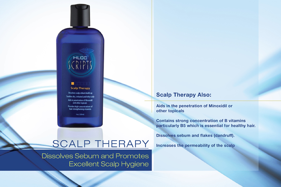 Scalp Therapy also: Aids in the penetration of Minoxidil or other topicals, contains strong concentration of B vitamins particularly B5 which is essential for healthy hair, dissolves sebum and flakes (dandruff) and increases the permeability of the scalp.