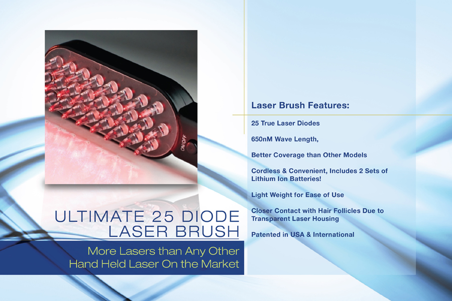 The Ultimate 25 Diode Laser Brush posseses some truly unique features, such as: 25 true laser diodes, 650nM Wave length, cordless & convenient, two sets of lithium ion batteries, light weight for ease of use, quality-CE certified and this brush has closer contact with your hair follicles thanks to a transparent laser housing
